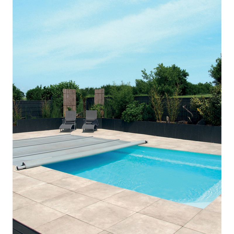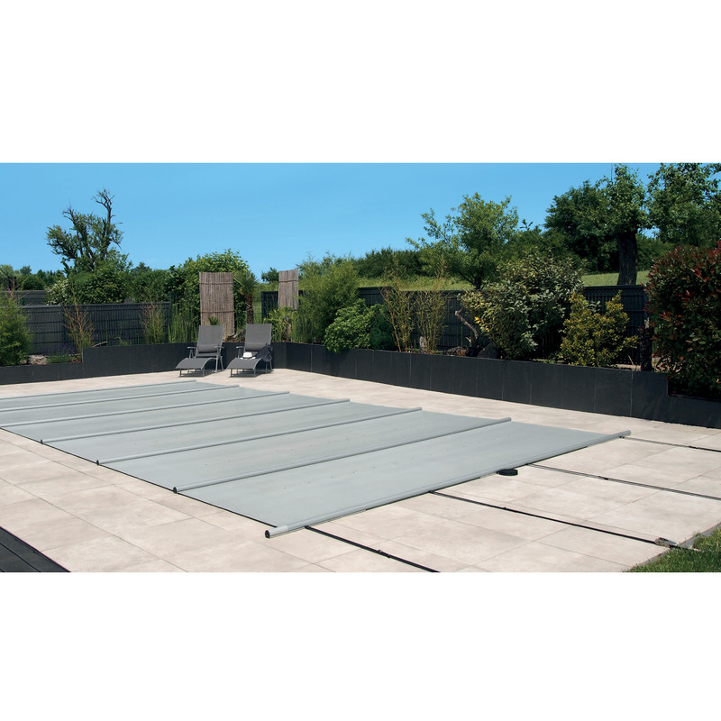 Bâche à barres à panneaux interchangeables avec profils 1/2 rond Ø44mm en aluminium anodisé double gorges pour bassin de 11x5m maximum.