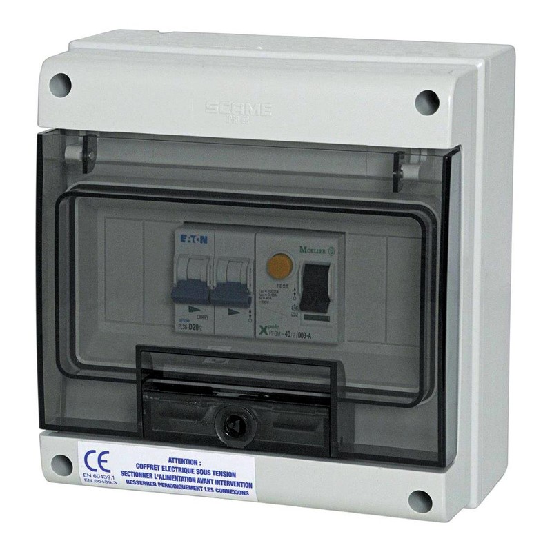 Disjoncteur bi-polaire courbe D* (10, 16, 20 ou 25 A). Interrupteur différentiel 30 mA 40A. Coffret IP66. *Protection préconisée par les principaux constructeurs. Info-tri PRODUITS EEE : ... Plus de détails