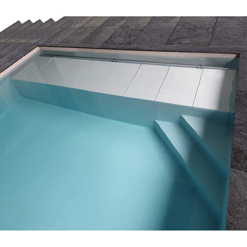 Avec mur de séparation maçonné : lames indispensables entre le fil d’eau et la descente à l’axe, couverture fermée (ex : pour un bassin de 4x8m nous livrons 9m de lames, soit 1m de plus)