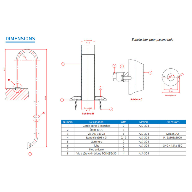 Échelle inox pour piscine bois CARACTÉRISTIQUES : • Spéciale piscines en bois. • Fabriquée avec un tube en acier inoxydable AISI-304 de 43 mm de diamètre et de 1,2 mm d’épaisseur. • ... Plus de détails