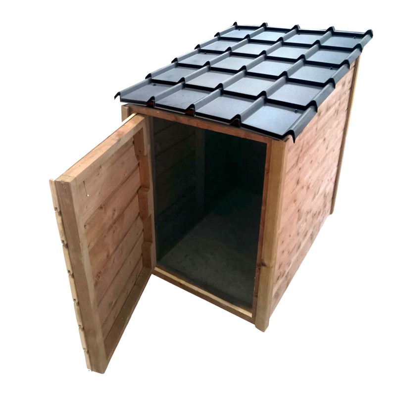 Locaux en pin maritîme classe 4 marron et toiture en plaque d’acier imitation tuile anthracite. Ouverture totale de la toiture. Livré avec notice de montage.