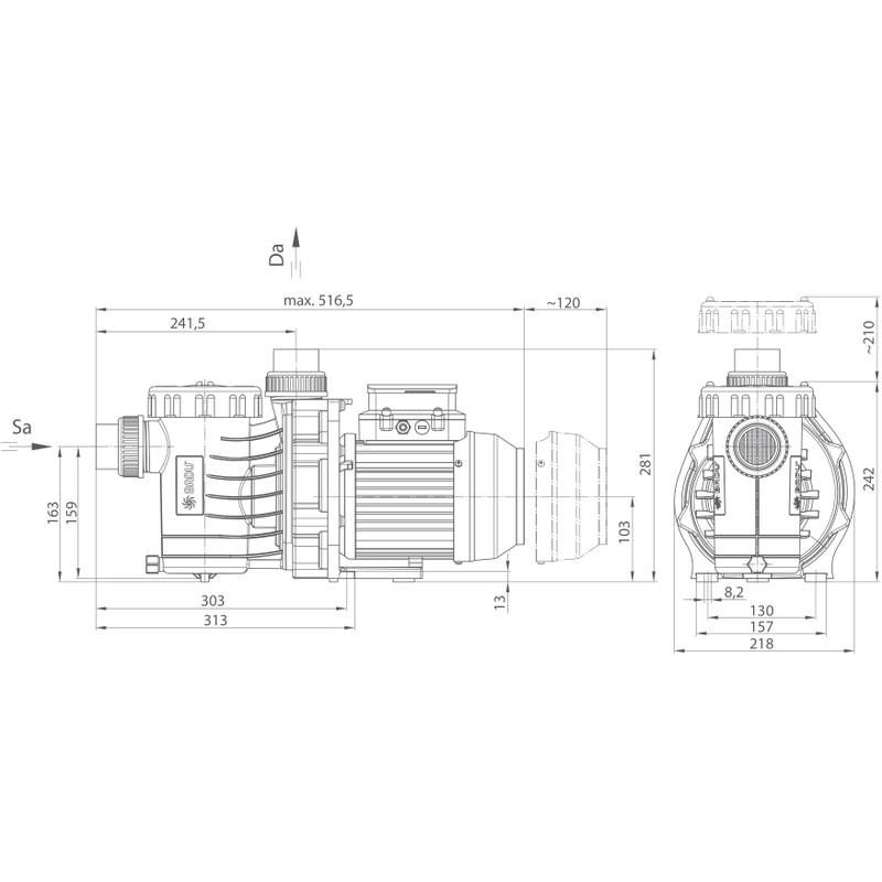 • Raccordement hydraulique: raccord à coller Ø 50 mm pour le refoulement et l’aspiration