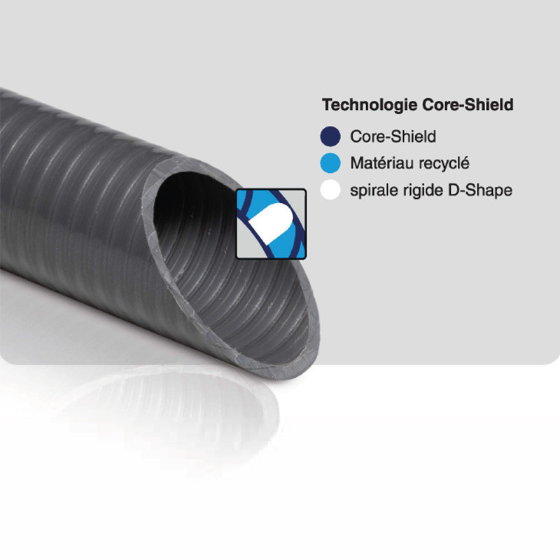 Structure : Tuyau spiralé en PVC lisse à l’intérieur et avec une spirale en PVC rigide de renforcement à l’extérieur (brevet D-Shape). Le brevet CORESHIELD incorpore le matériau recyclé en l’isolant à l’extérieur et à l’intérieur et garantit la durabilité dans le temps.